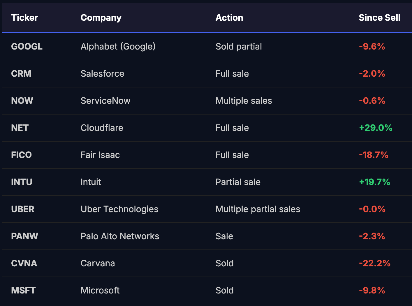 4. Growth tech is overvalued. Selling Salesforce, ServiceNow, Cloudflare, FICO, and trimming Alphabet is a clear de-risking from high-multiple software names.